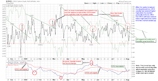 As a summary, I guess the market will pull back a bit. There is no solid evidence that the big trend is changed, so the game is still buy dip, sell bounce. Of course a lower low should not be formed if the pullback continues tomorrow. On the other hand, keep an eye on 2.8.0 CBOE Options Equity Put/Call Ratio, where $CPCE is close to the trendline again. For a more accurate $CPCE data during the trading hours (note the comment on the chart), you may refer to data on CBOE. But you have to calculate the ratio of Puts/Calls in Equity Options column manually. Usually the intraday ratio isn't so different from the ratio at the market close.